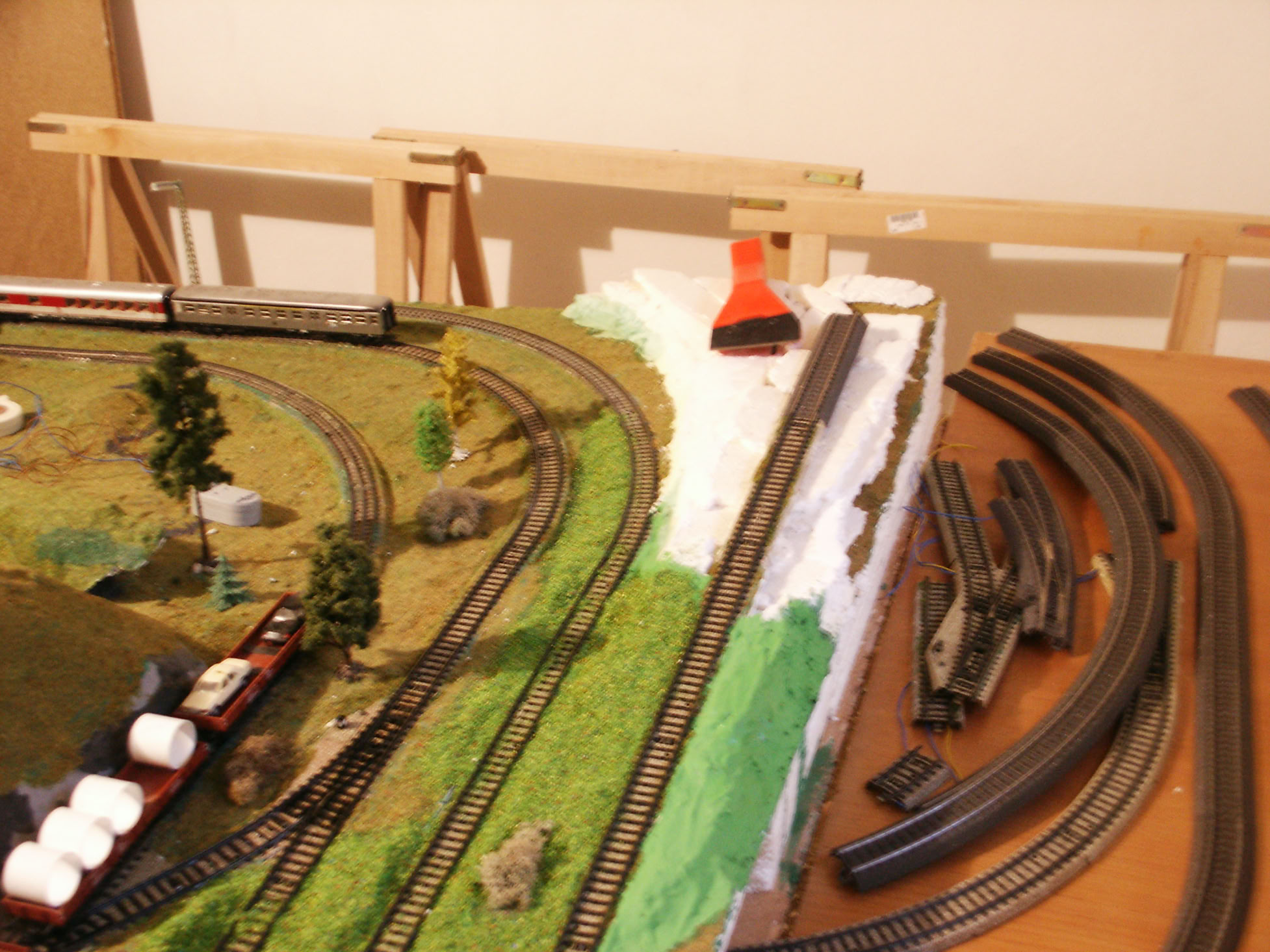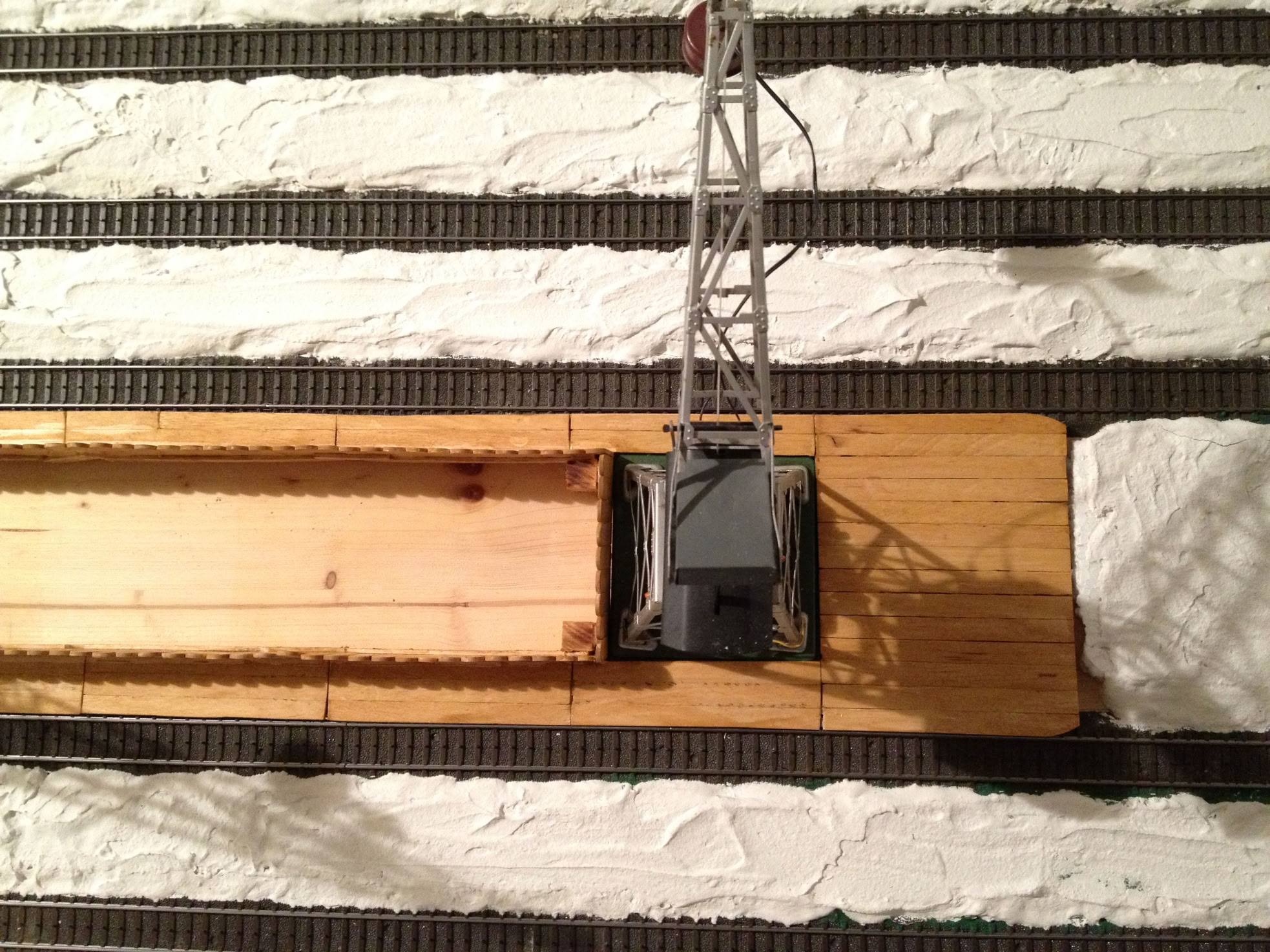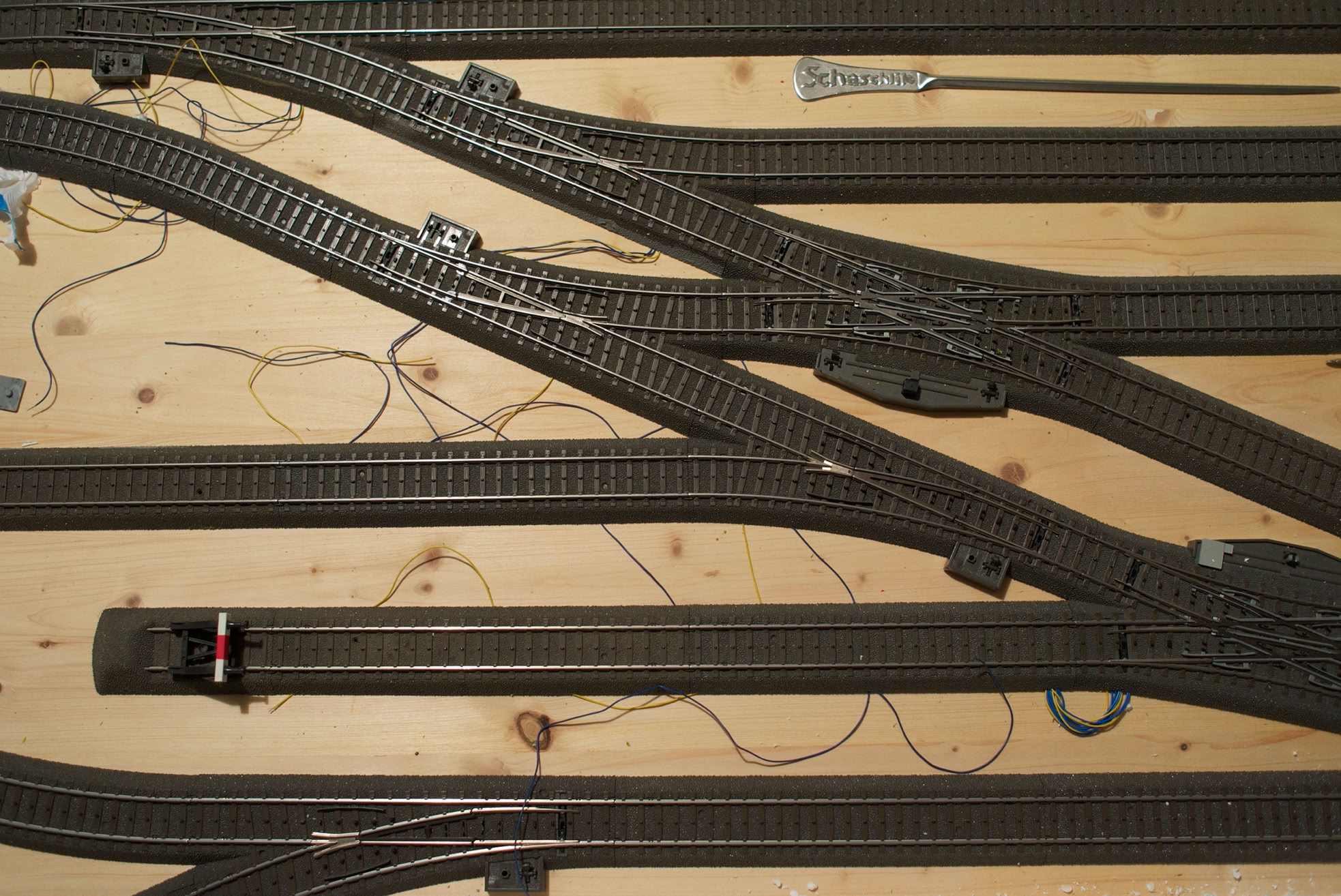 Der Vorteil einer einspurigen Unterfahrung ist, dass es leichter ist den Gleisverlauf unter der Platte zwischen den Holzböcken hindurchzuschlängeln. Das Gleis liegt auf ausgesägten Holzplatten und wird mit Holzstützen von unten an die Platte geschraubt.