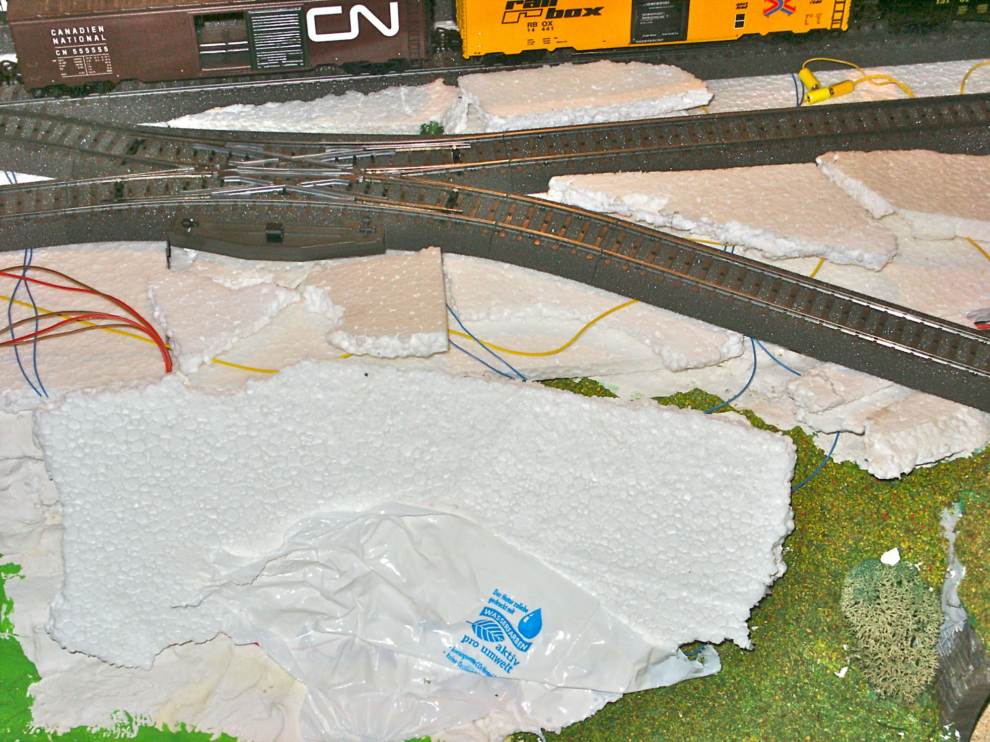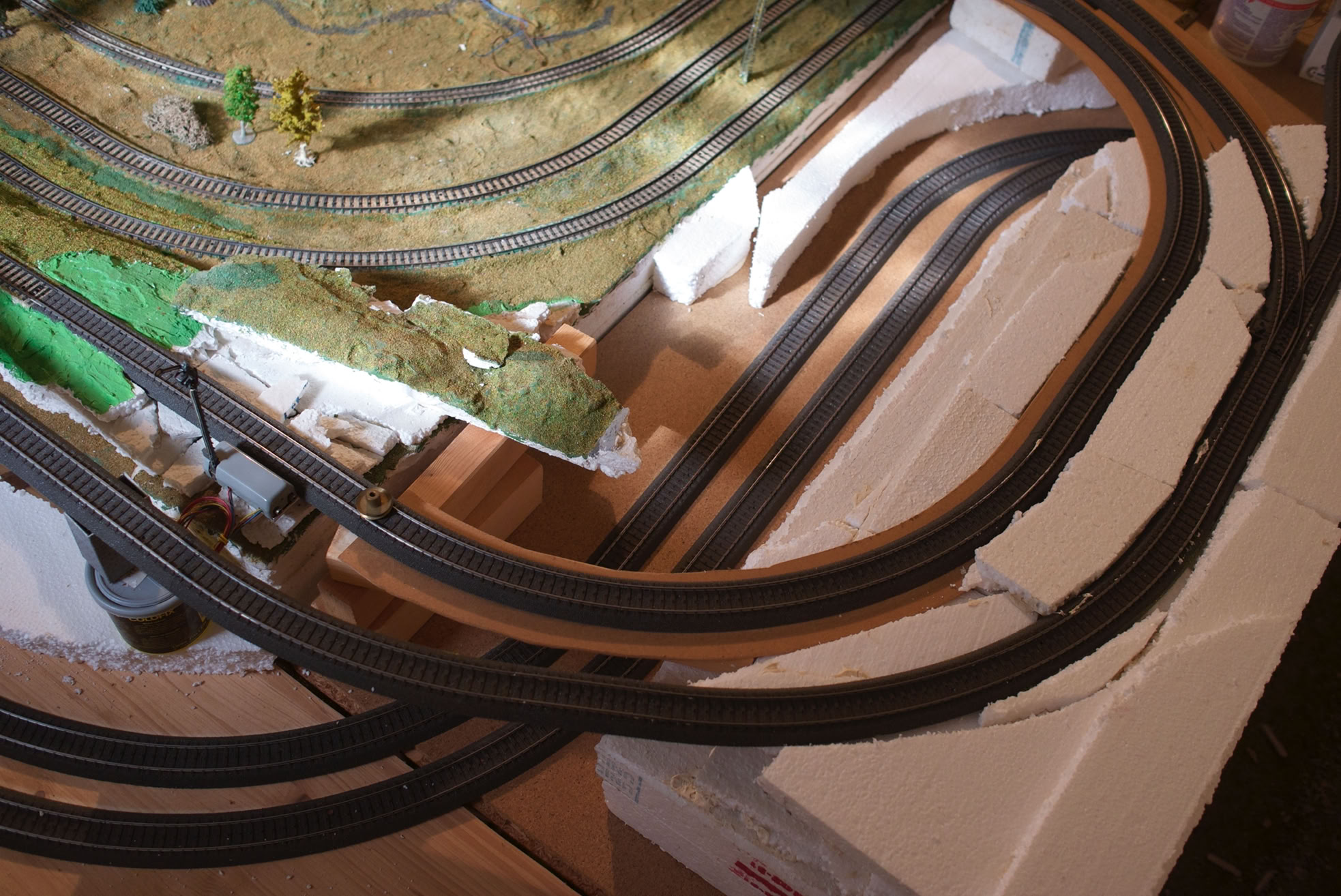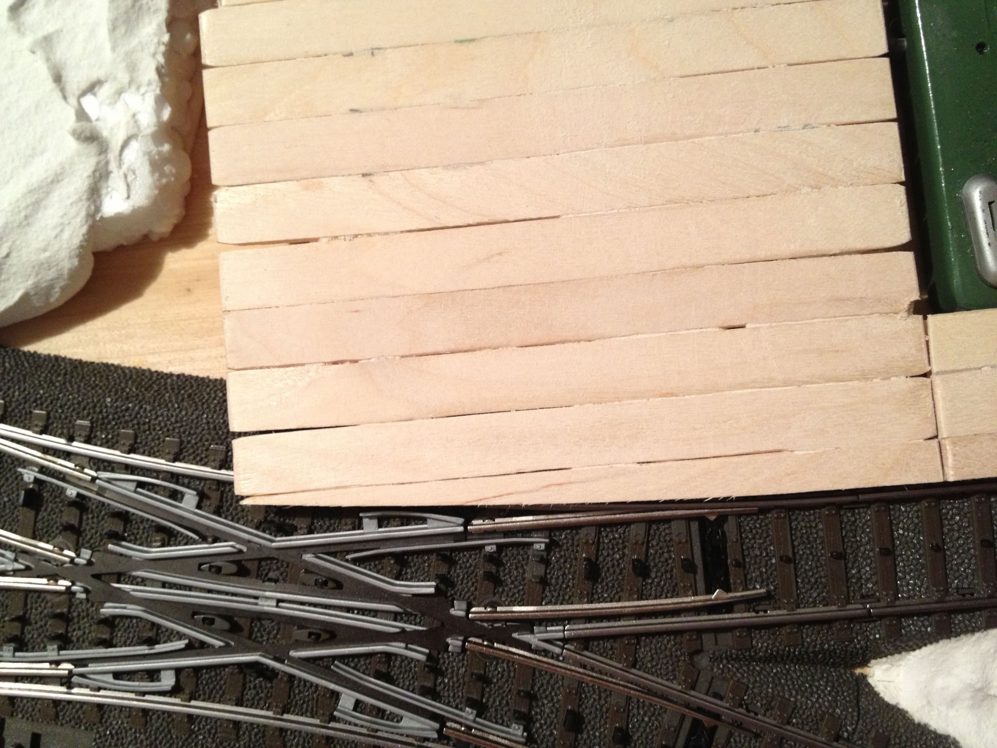 Der Vorteil einer einspurigen Unterfahrung ist, dass es leichter ist den Gleisverlauf unter der Platte zwischen den Holzböcken hindurchzuschlängeln. Das Gleis liegt auf ausgesägten Holzplatten und wird mit Holzstützen von unten an die Platte geschraubt.