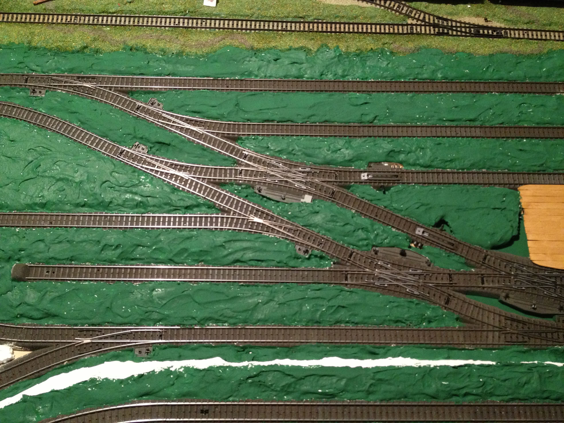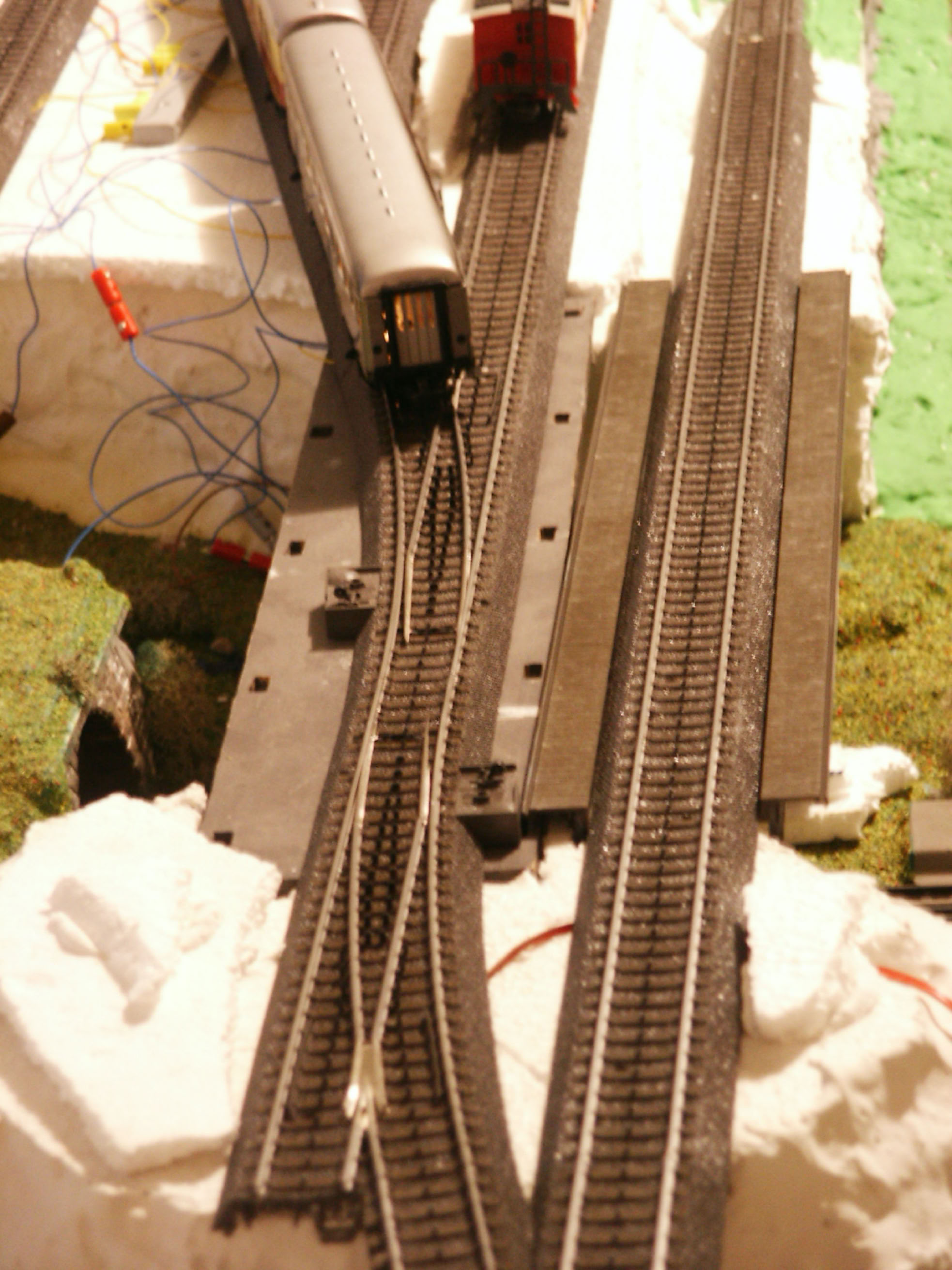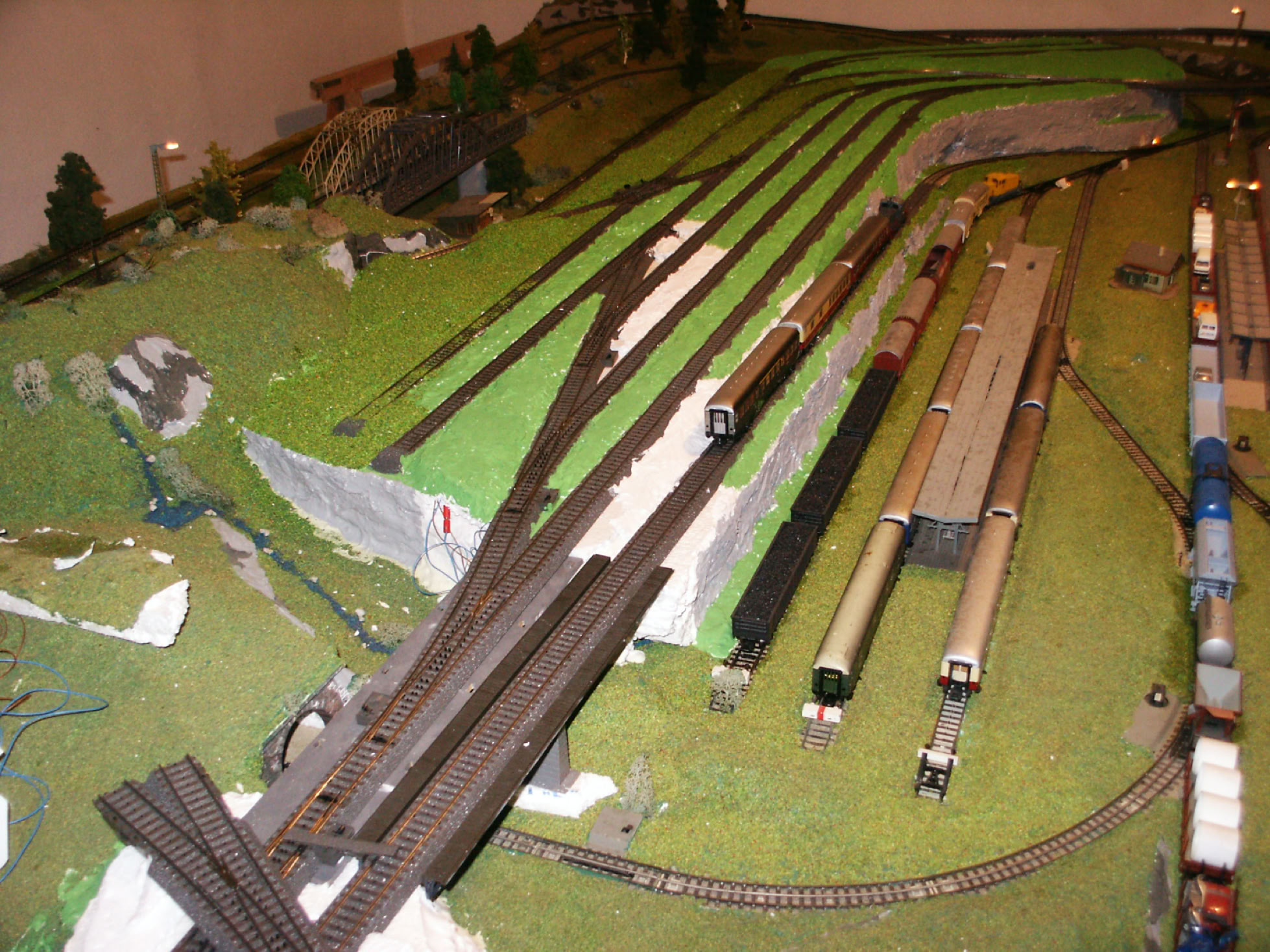 Die andere Abfahrt liegt im linken Anlagenbereich und verfügt über 2 Gleisanschlüsse. Der eine (links im Bild) wird erreicht, wenn der Güterbahnhofbereich durchfahren wird. Der andere Anschluss erfolgt über die große Gitterbrücke (rechts im Bild) und beide münden über eine Bogenweiche in die einspurige Unterfahrung.