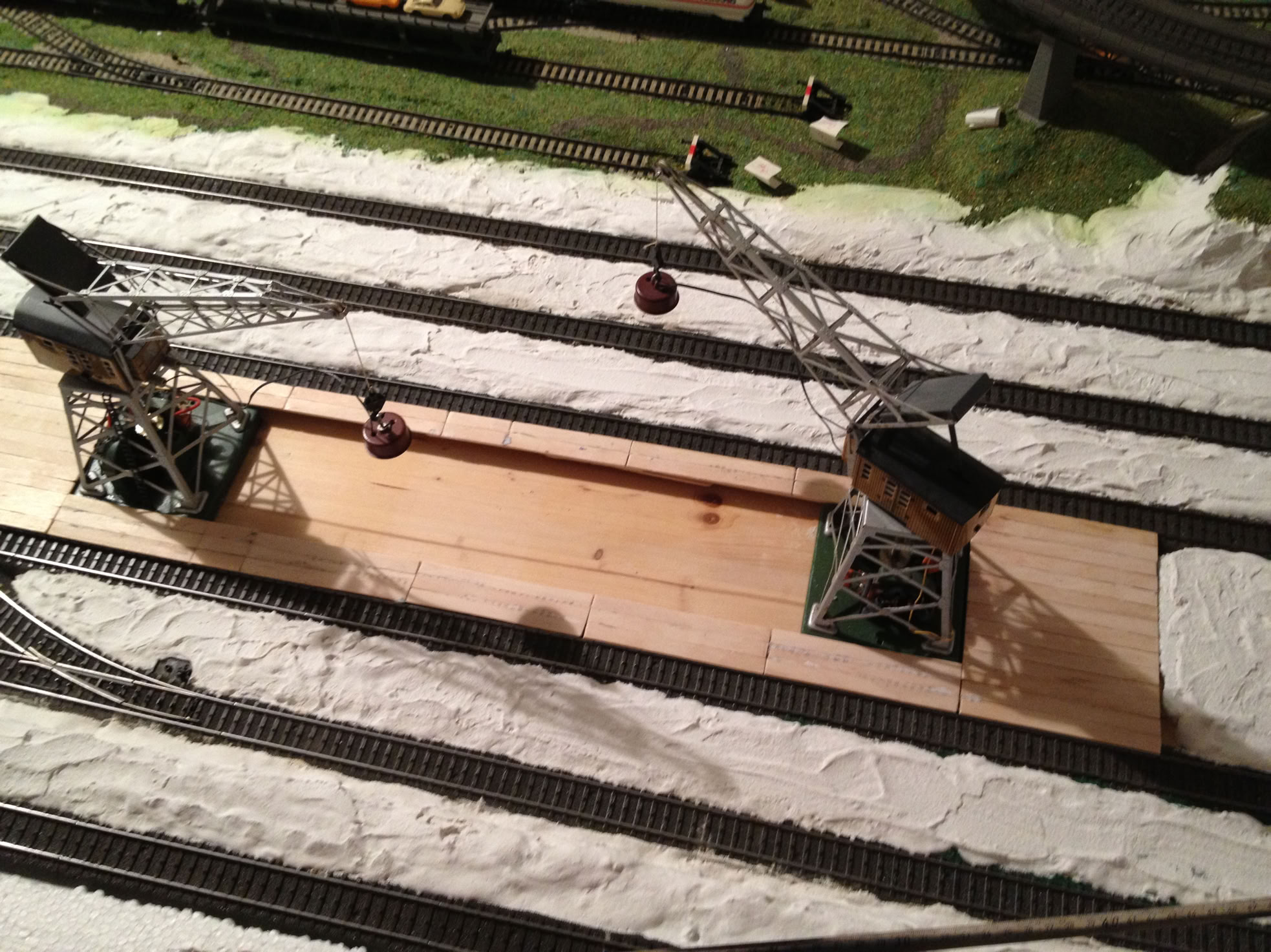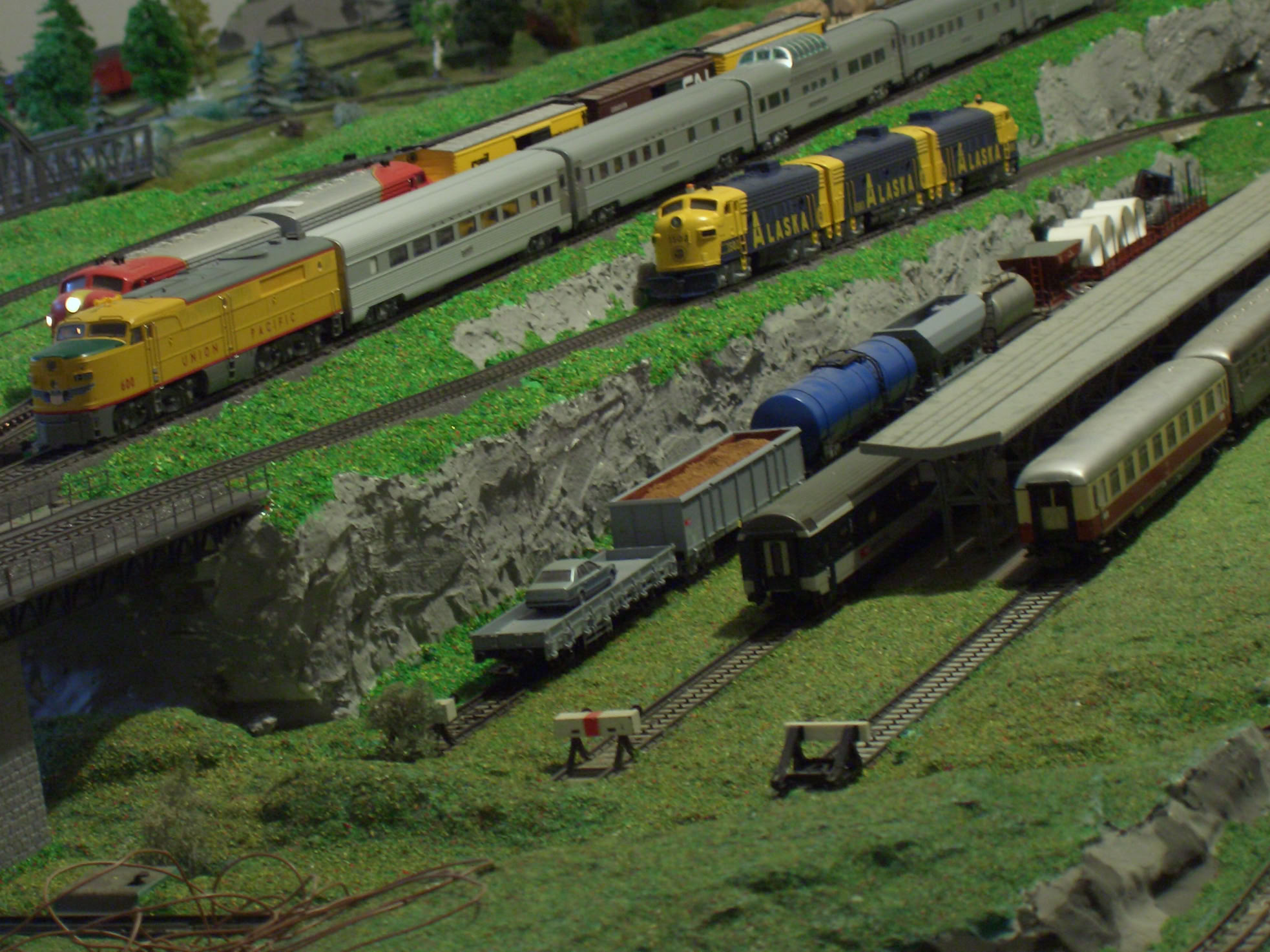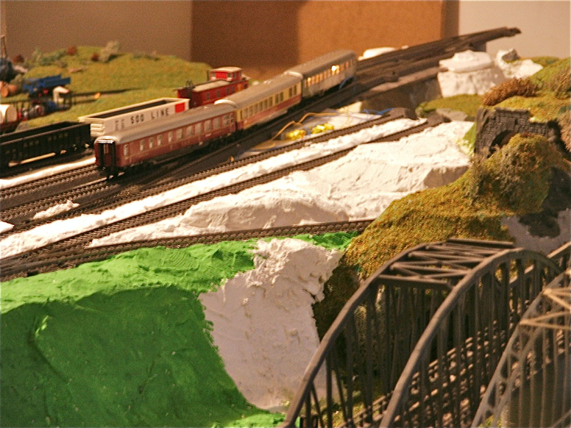 Die andere Abfahrt liegt im linken Anlagenbereich und verfügt über 2 Gleisanschlüsse. Der eine (links im Bild) wird erreicht, wenn der Güterbahnhofbereich durchfahren wird. Der andere Anschluss erfolgt über die große Gitterbrücke (rechts im Bild) und beide münden über eine Bogenweiche in die einspurige Unterfahrung.