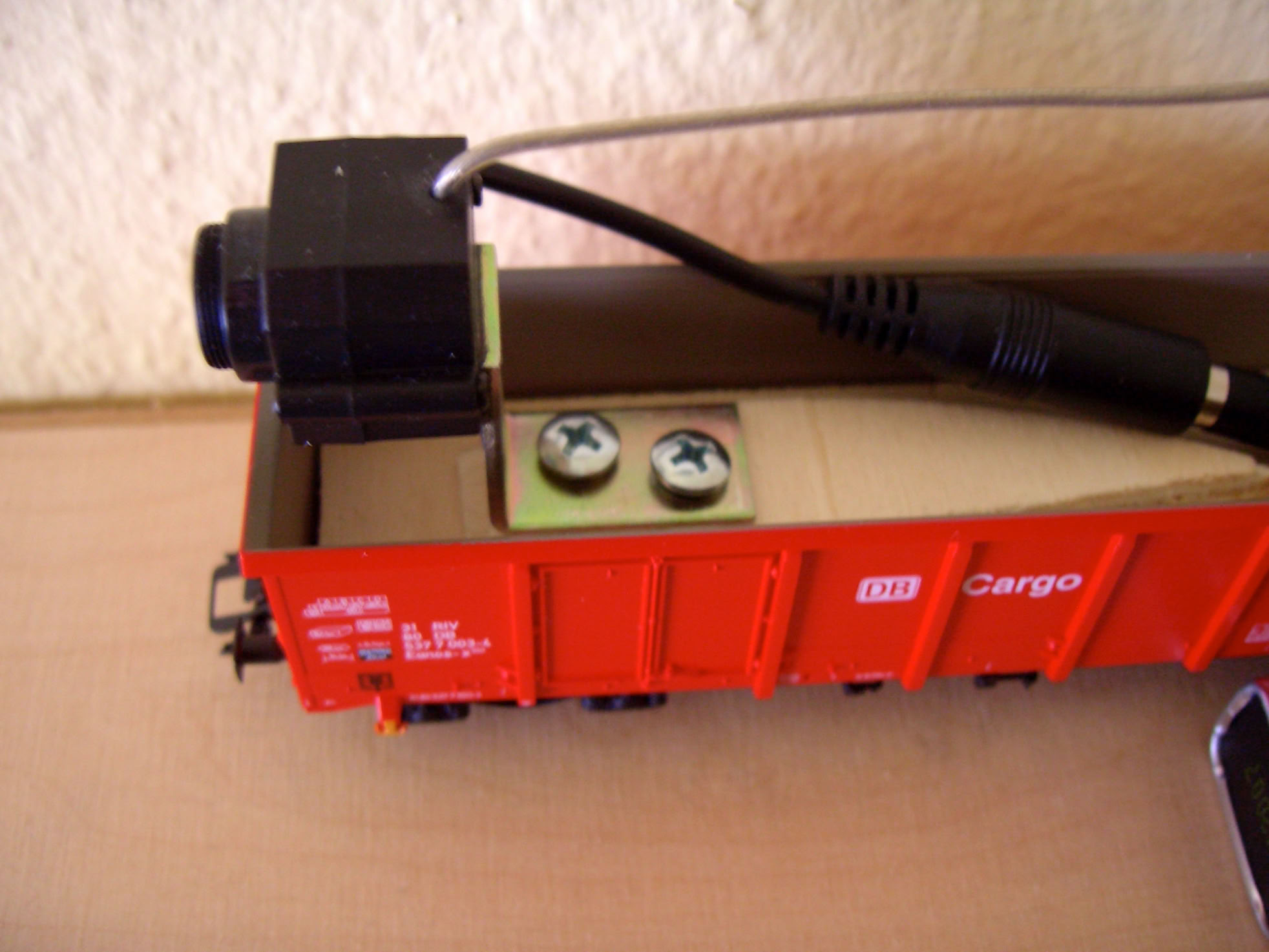 Basis ist ein offener Güterwaggon von Märklin. In diesen wird ein dünnes ausgesägtes Holzstück eingelegt, welches die weitere Aufnahme der Kamera trägt.