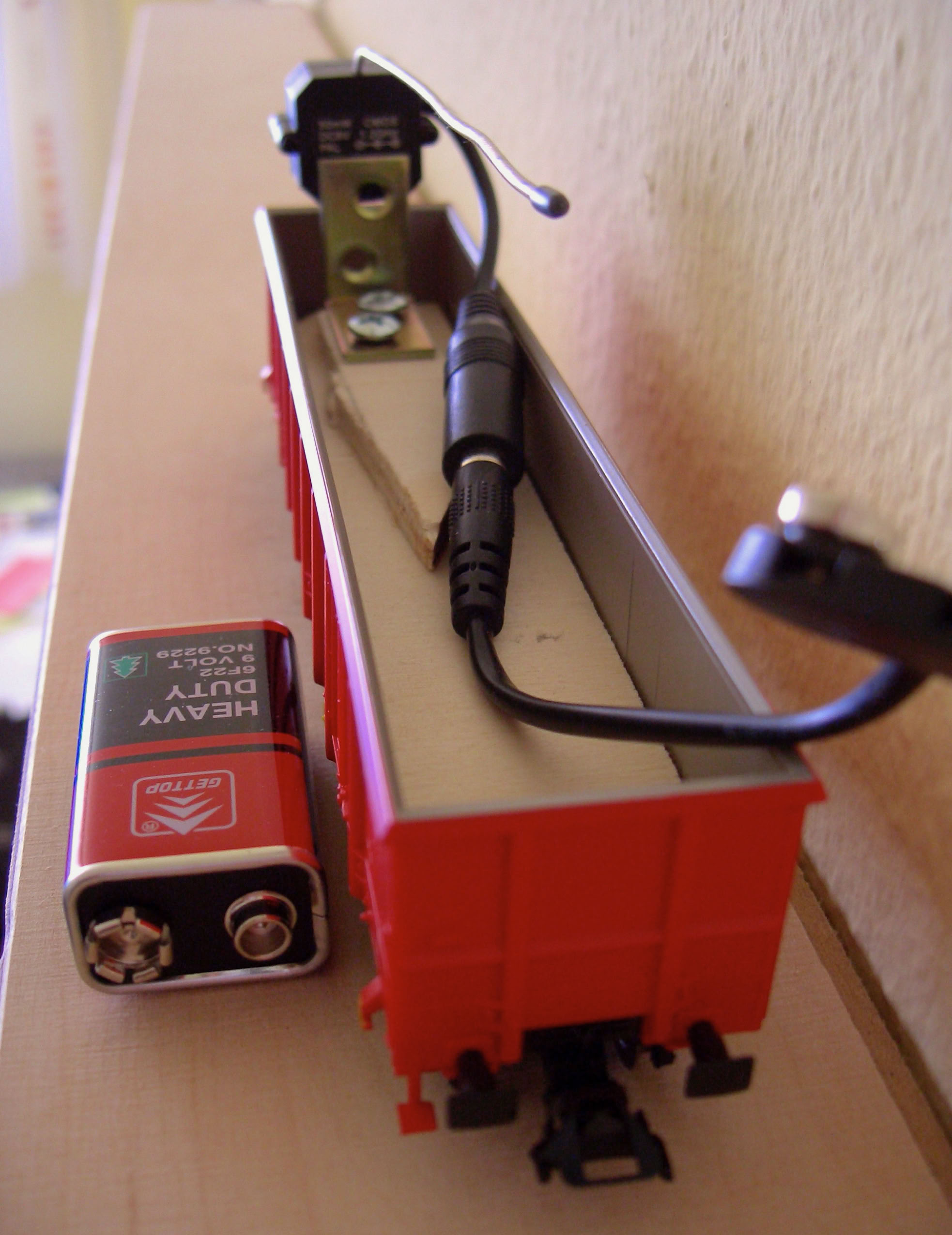 Die Energieversorgung der Kamera erfolgt mittels einer 9V Block-Batterie. Diese findet ebenfalls im Waggon platz.