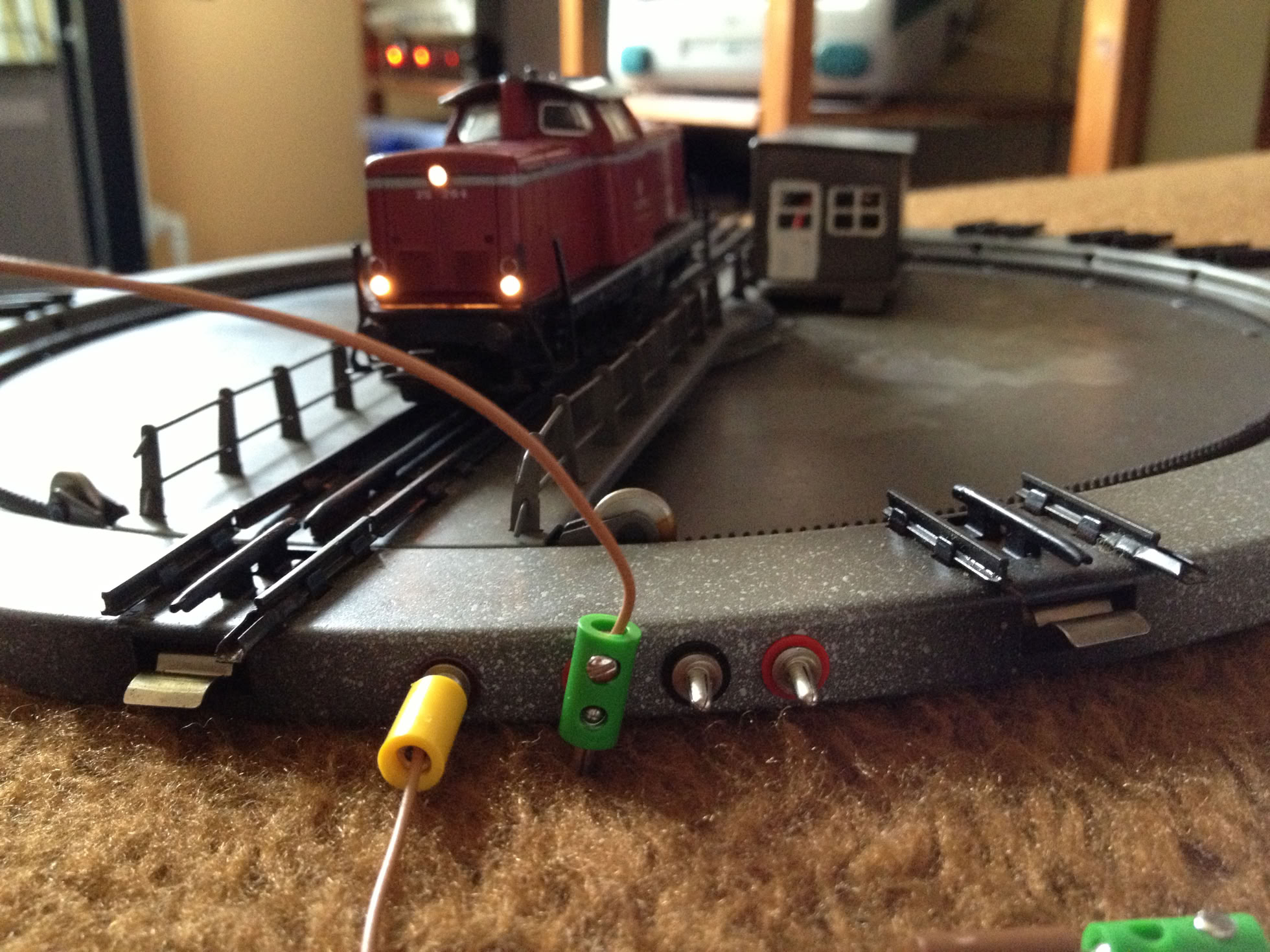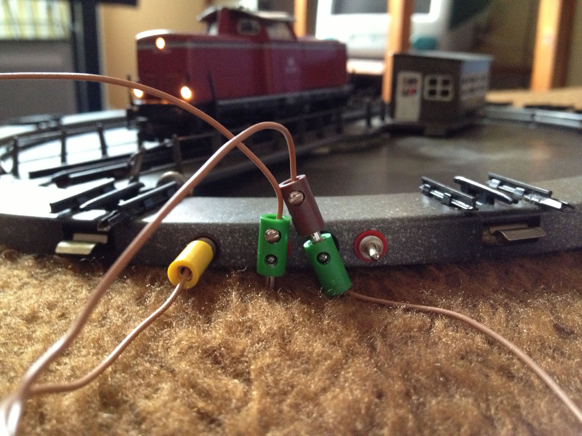 Beim Anschein von Fahrspannung wird das rote Kabel immer an den Mittelleiter angeschlossen, das braune Kabel an die beiden Schienenstränge.