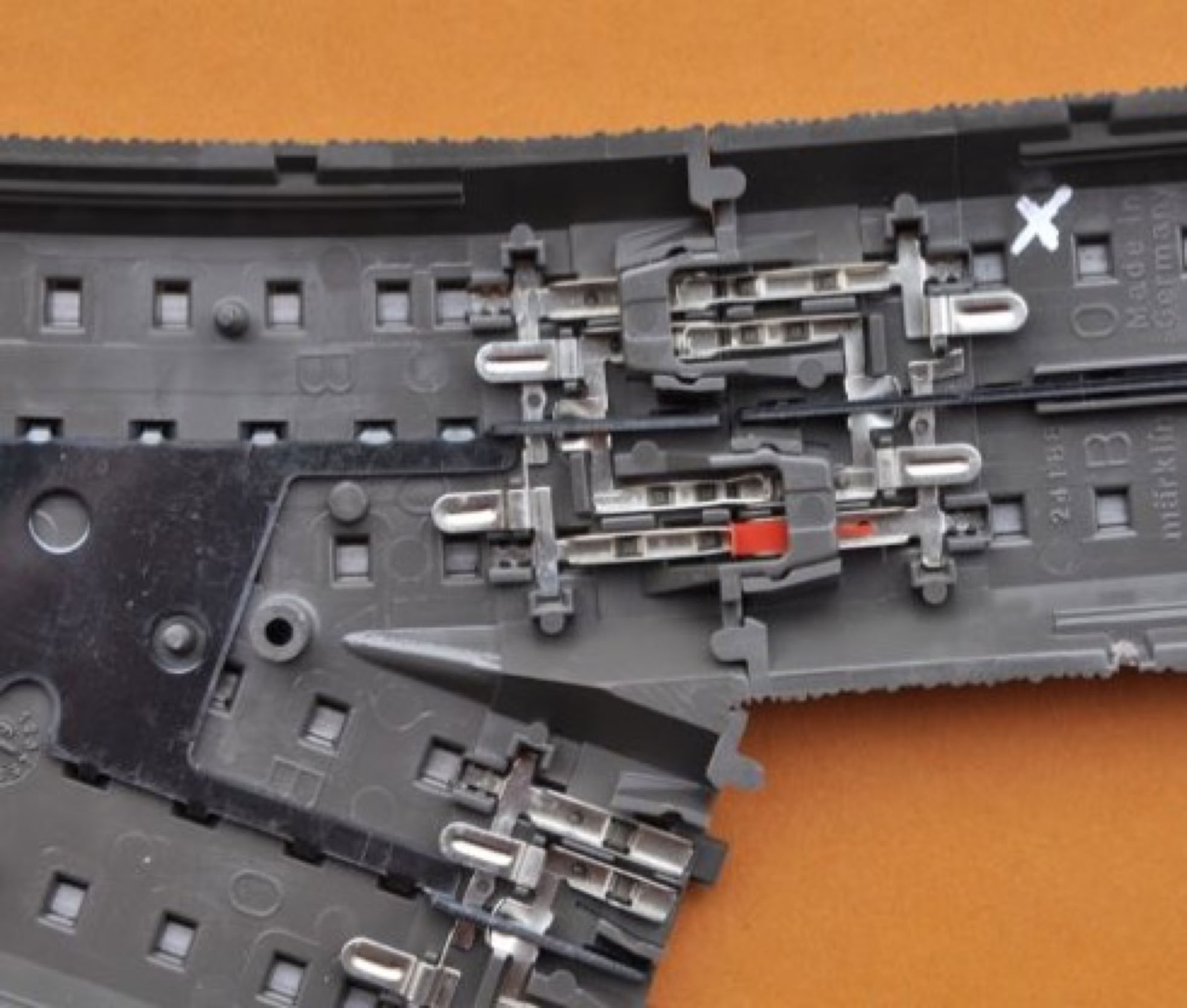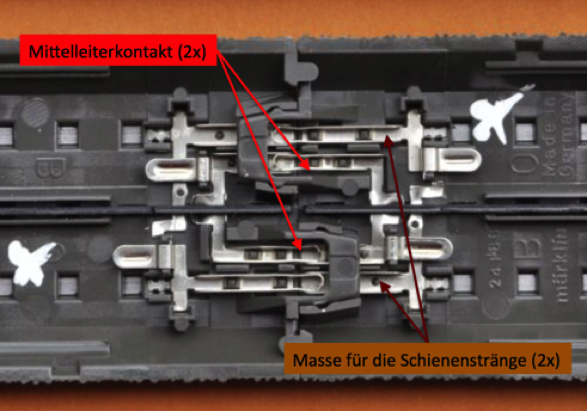 Von den 4 Kontakten sind die beiden äußeren Steckkontakte immer für die Schienenstränge, die beiden inneren für den Mittelleiter vorgesehen. Alles ist redundant ausgeführt, um maximale Betriebsicherheit zu gewährleisten. Deswegen habe ich mich unter anderem für Märklin entschieden.
