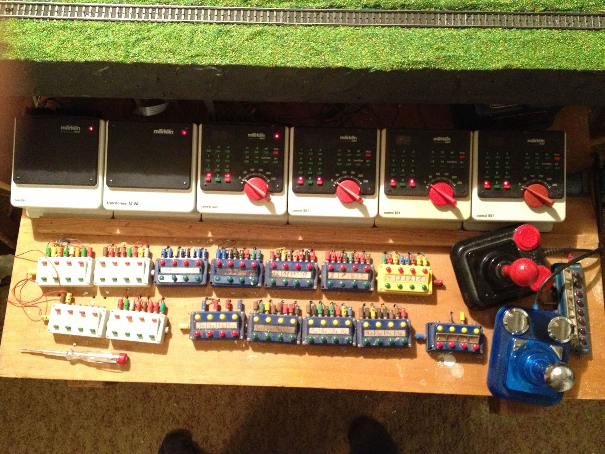 Als Beispiel bei mir in der Anlage ist eine lange einspurige Strecke, welche unter der Grundplatte als Unterführung verläuft. Diese Strecke hat 3 Zufahrten und ist noch mit einem Schattenbahnhof ebenfalls im Untergrund kombiniert. Auch dieser ist kaum sichtbar, da er nur zum Abstellen langer Zugformationen dient. Ich werde also mindestens 3 Signale an den Zufahrten aufstellen, welche bei freier Strecke erst mal auf grün stehen.