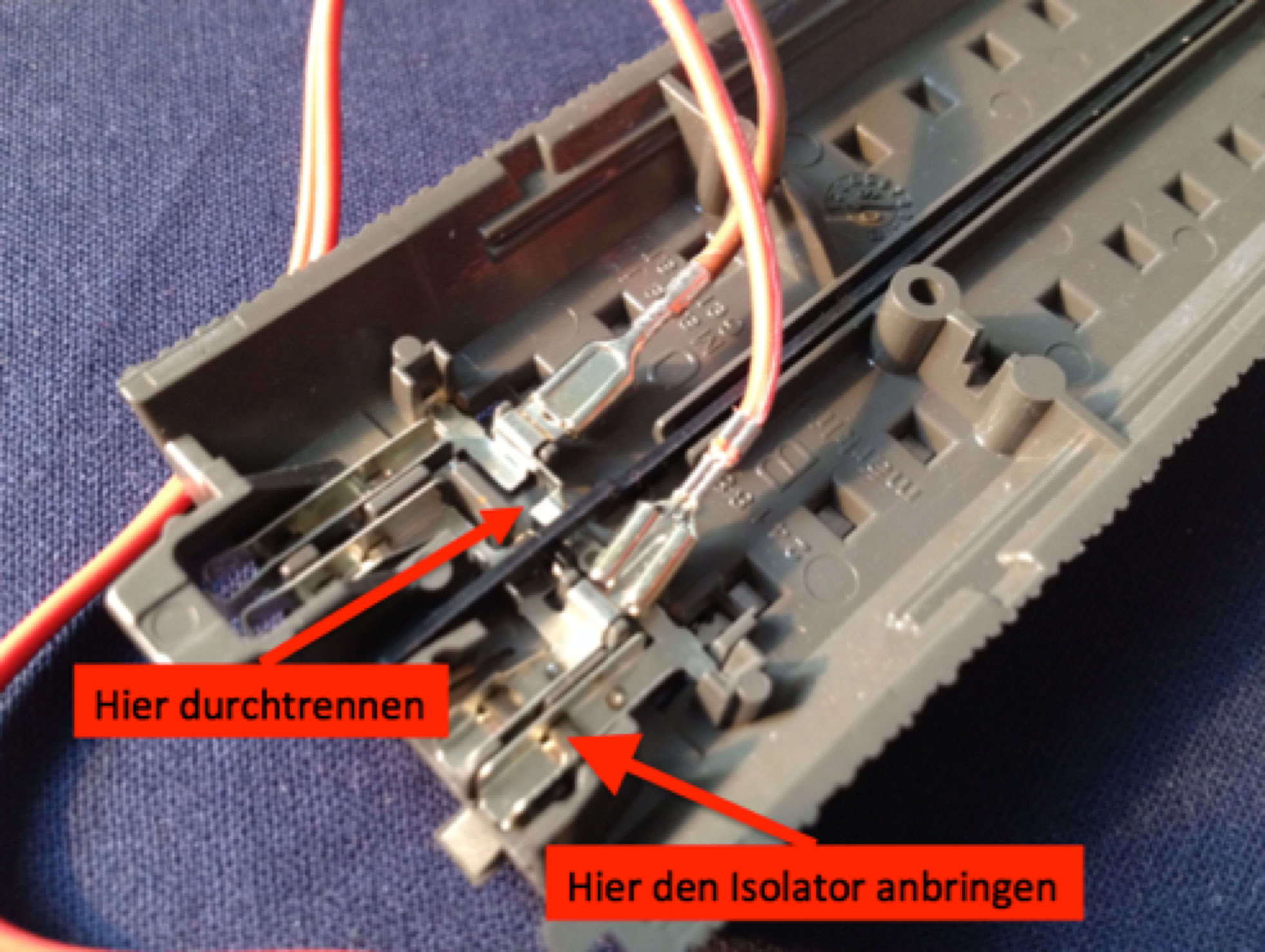 Angenommen wir möchten einen Streckenabschnitt mit einer Besetztmeldung ausstatten, so müssen wir das Gleis an beiden Enden gleich abändern. Zum einen sollte die Leitung zwischen der linken und rechten Schiene im Bereich des Steckbereichs mit dem anderen Gleis mit einer Zange unterbrochen werden und dann die Seite isolieren, an der man den Kabelschuh anbringen kann. Dasselbe natürlich an der anderen Seite des Gleises.