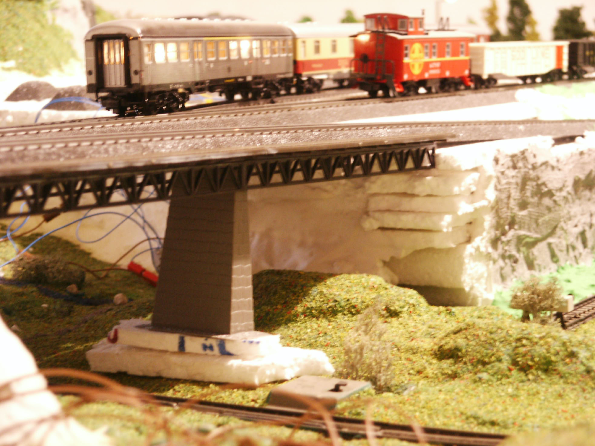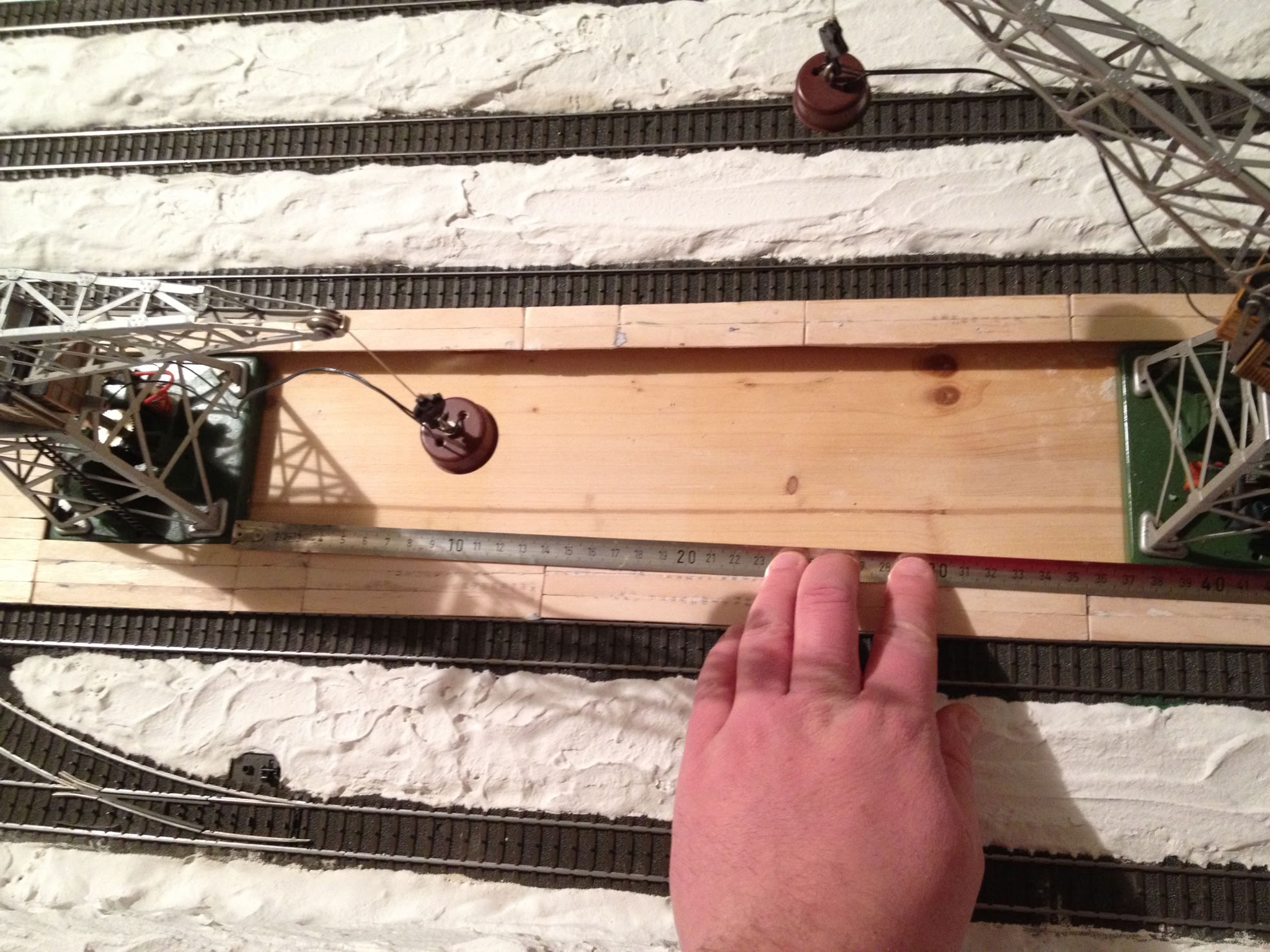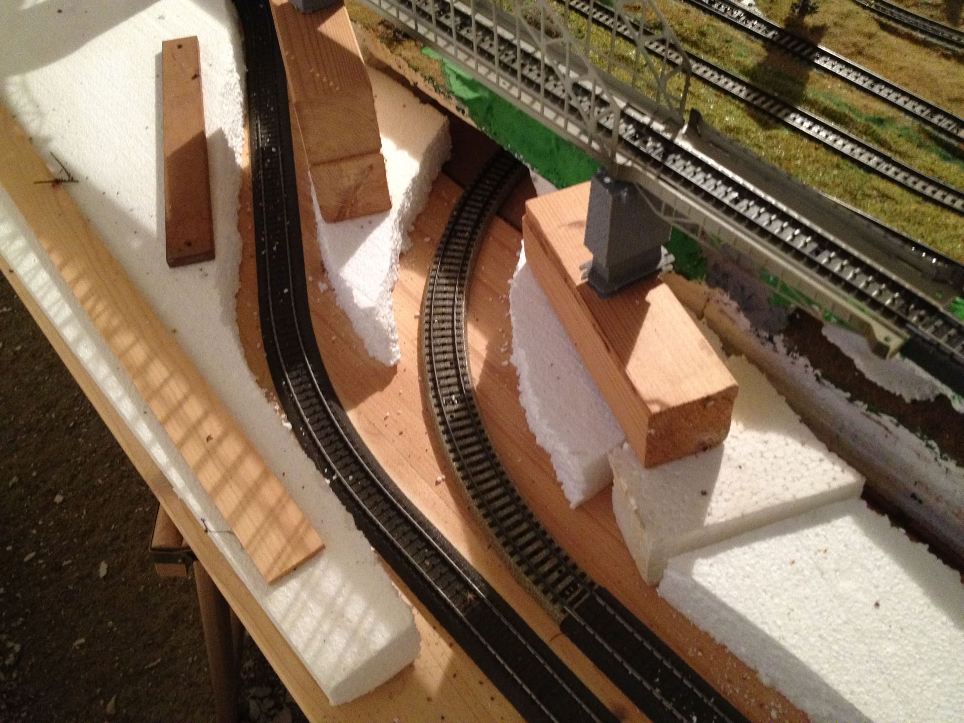Der Vorteil einer einspurigen Unterfahrung ist, dass es leichter ist den Gleisverlauf unter der Platte zwischen den Holzböcken hindurchzuschlängeln. Das Gleis liegt auf ausgesägten Holzplatten und wird mit Holzstützen von unten an die Platte geschraubt.