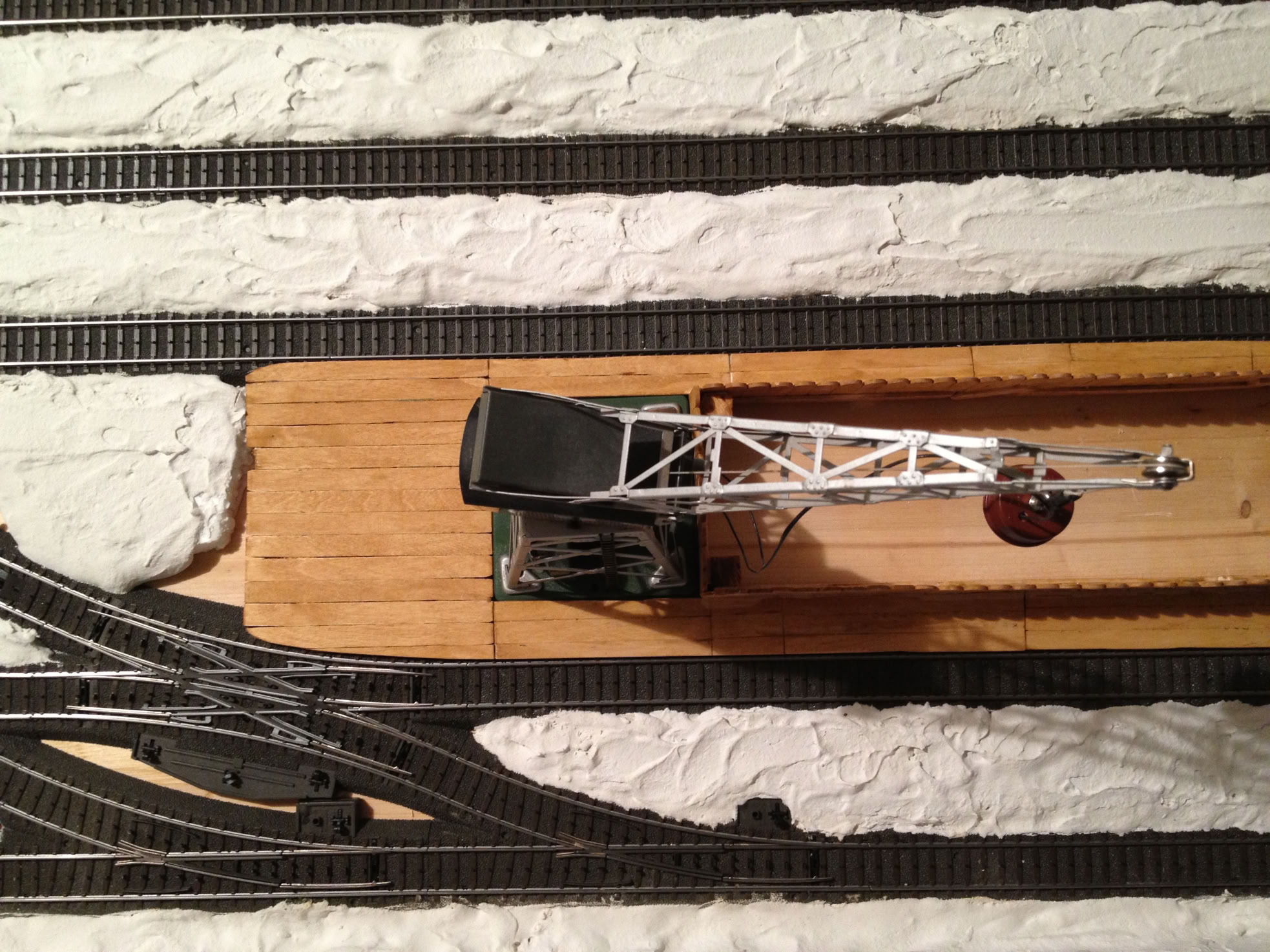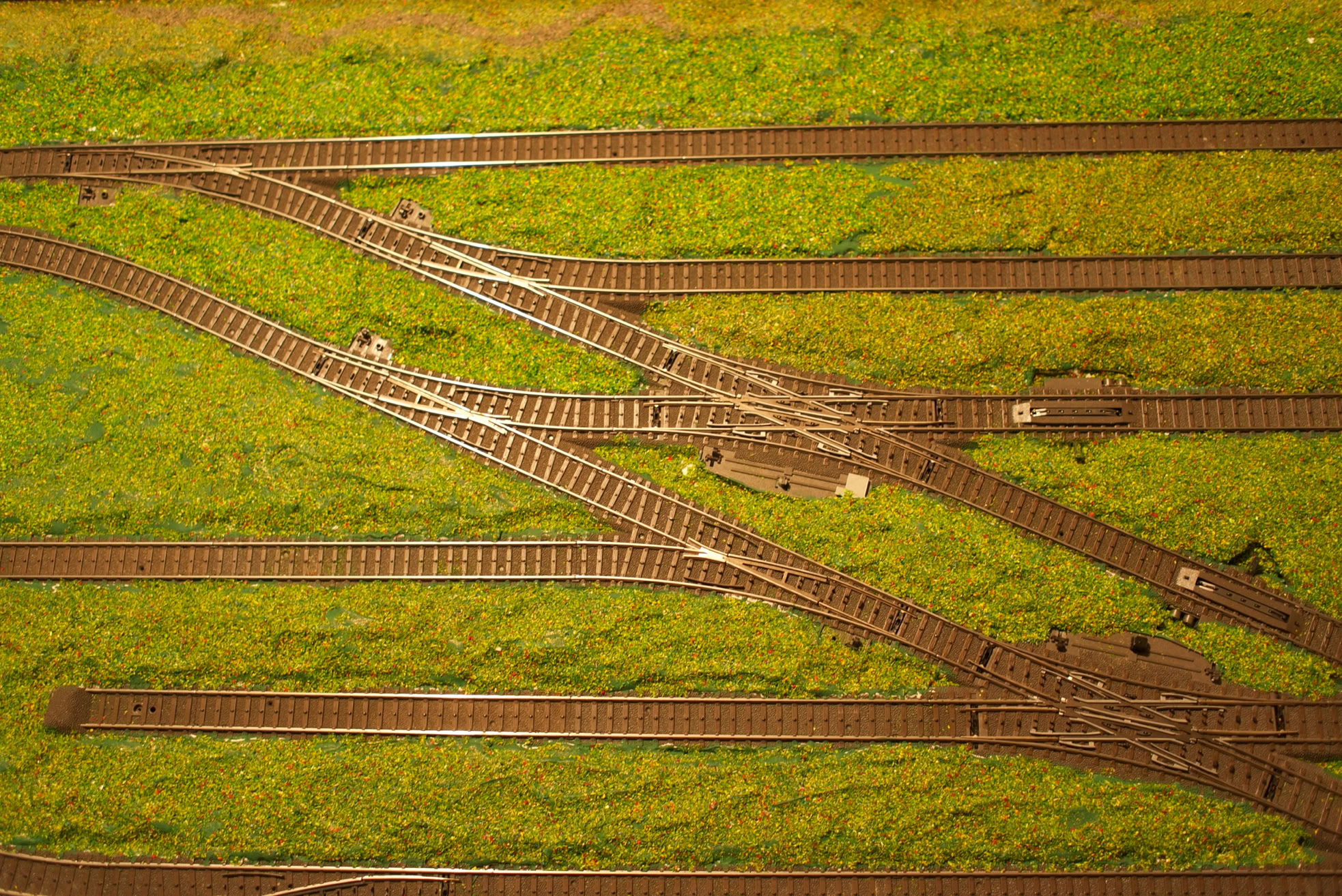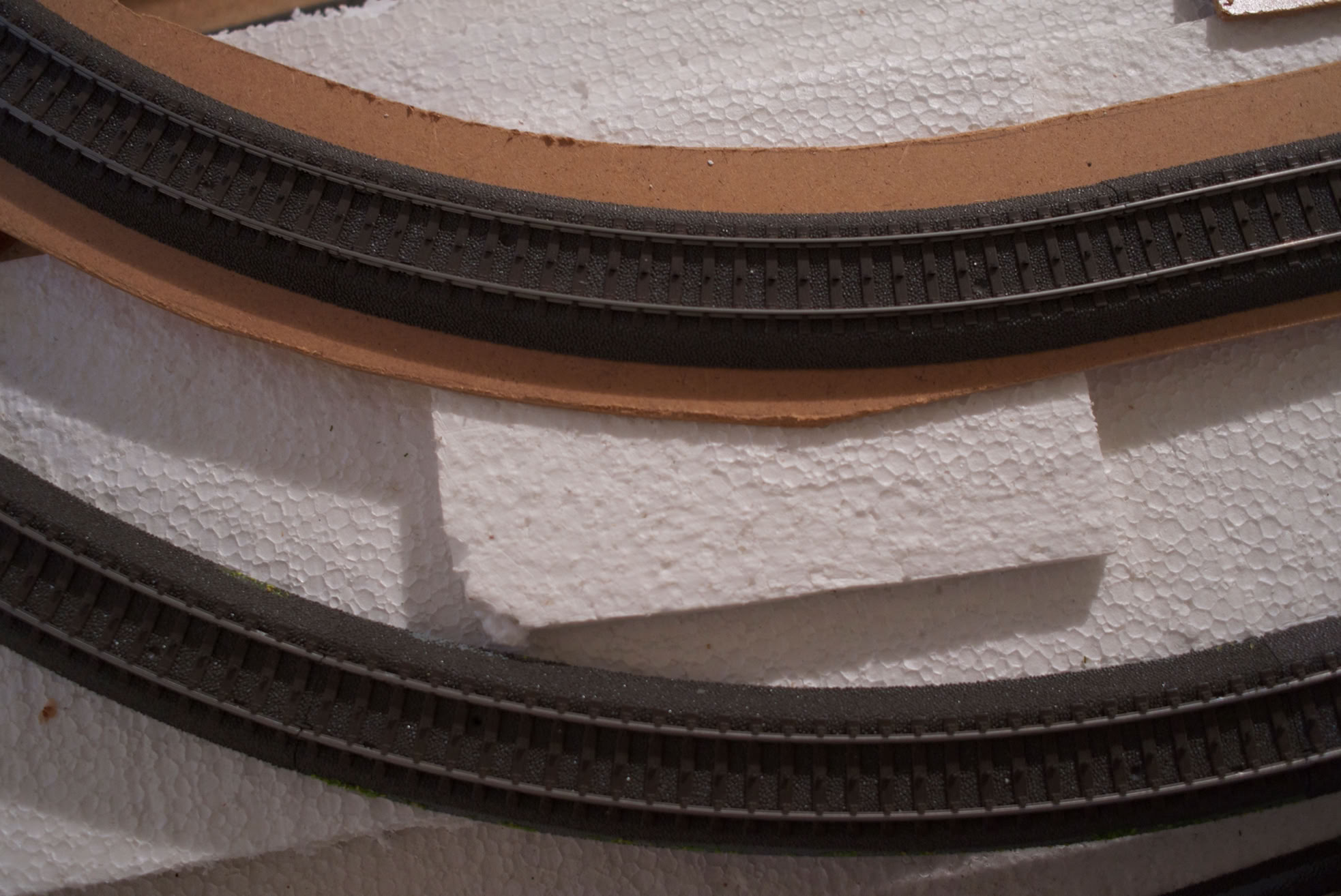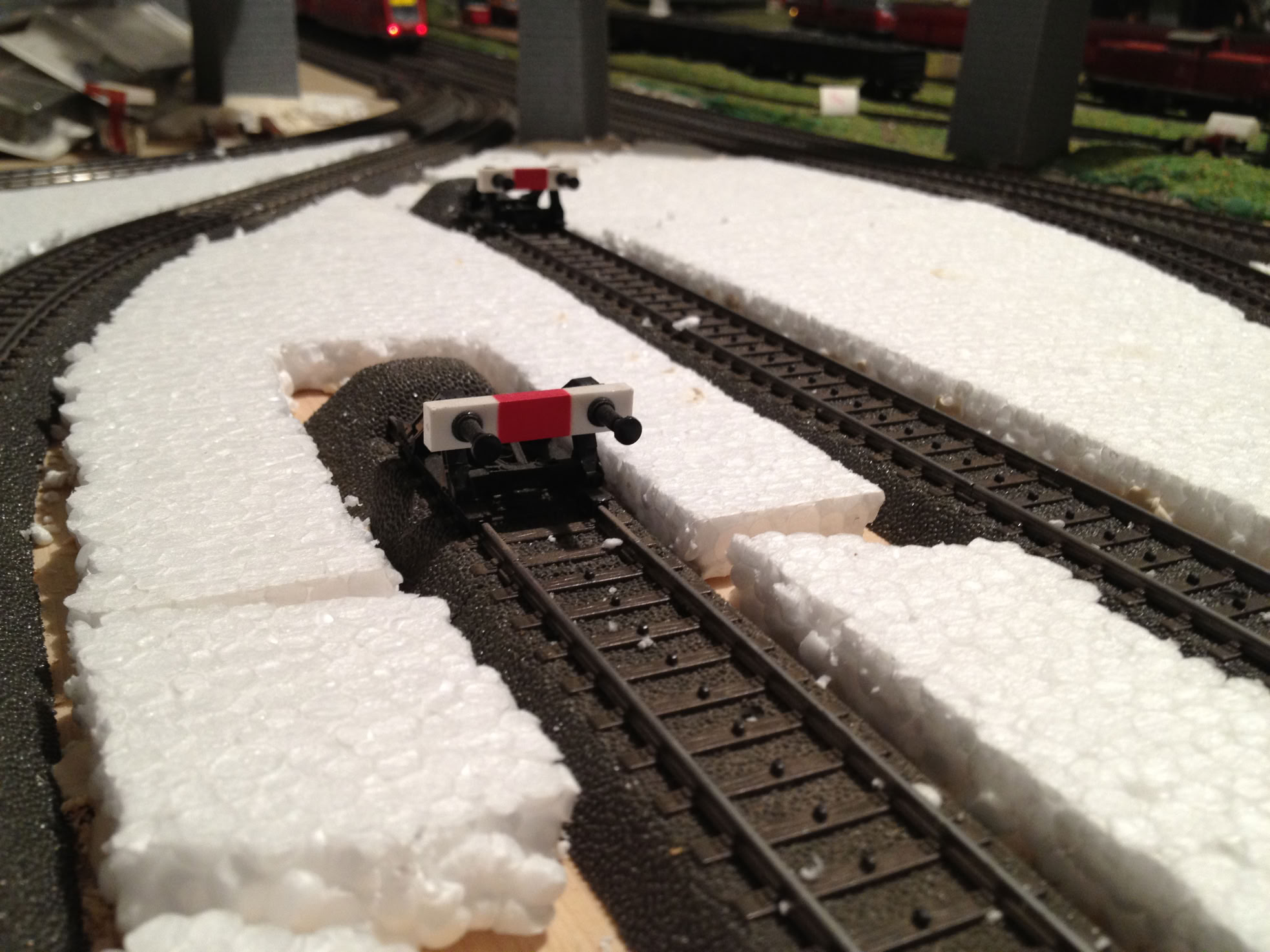 Der Vorteil einer einspurigen Unterfahrung ist, dass es leichter ist den Gleisverlauf unter der Platte zwischen den Holzböcken hindurchzuschlängeln. Das Gleis liegt auf ausgesägten Holzplatten und wird mit Holzstützen von unten an die Platte geschraubt.