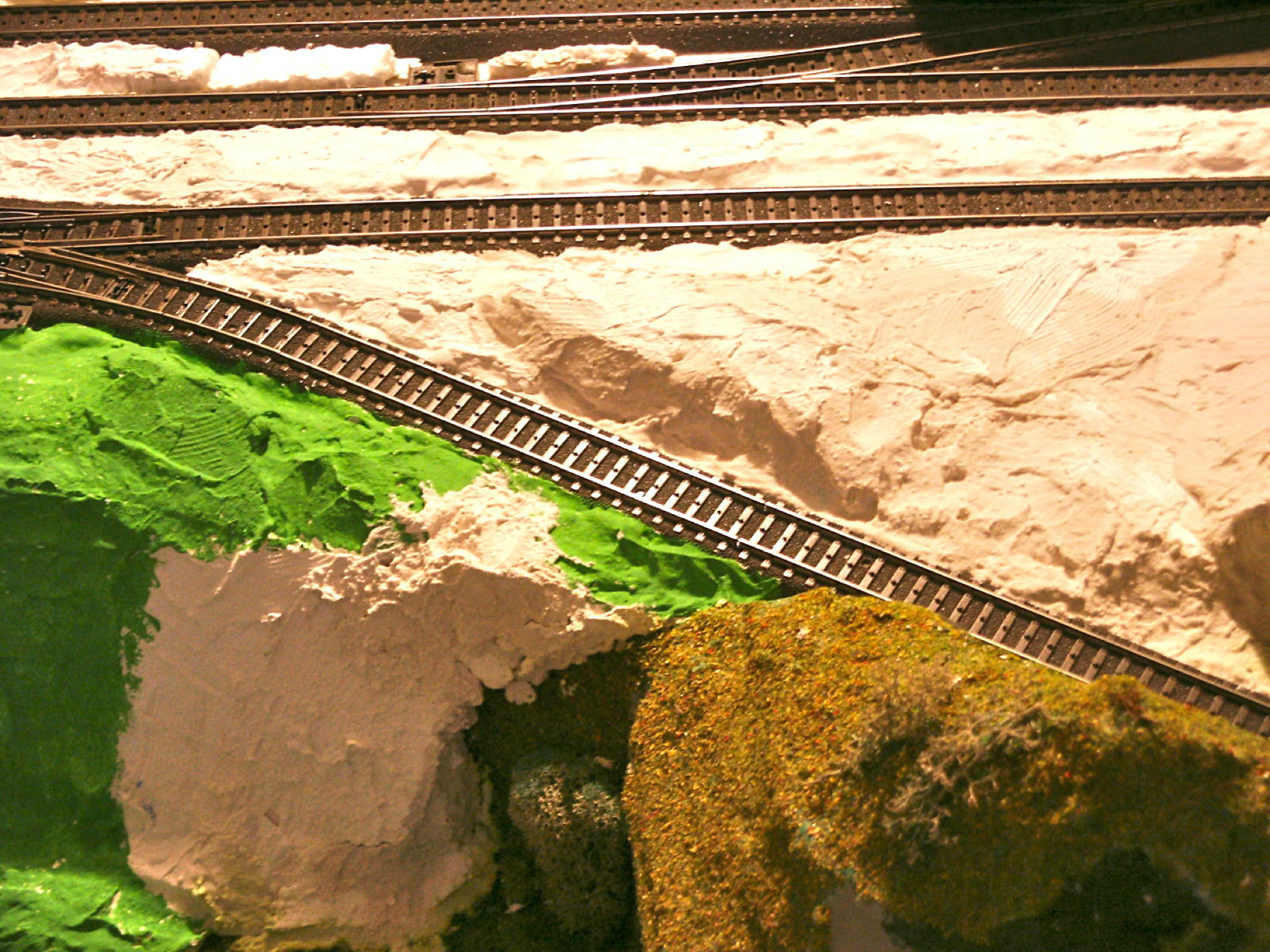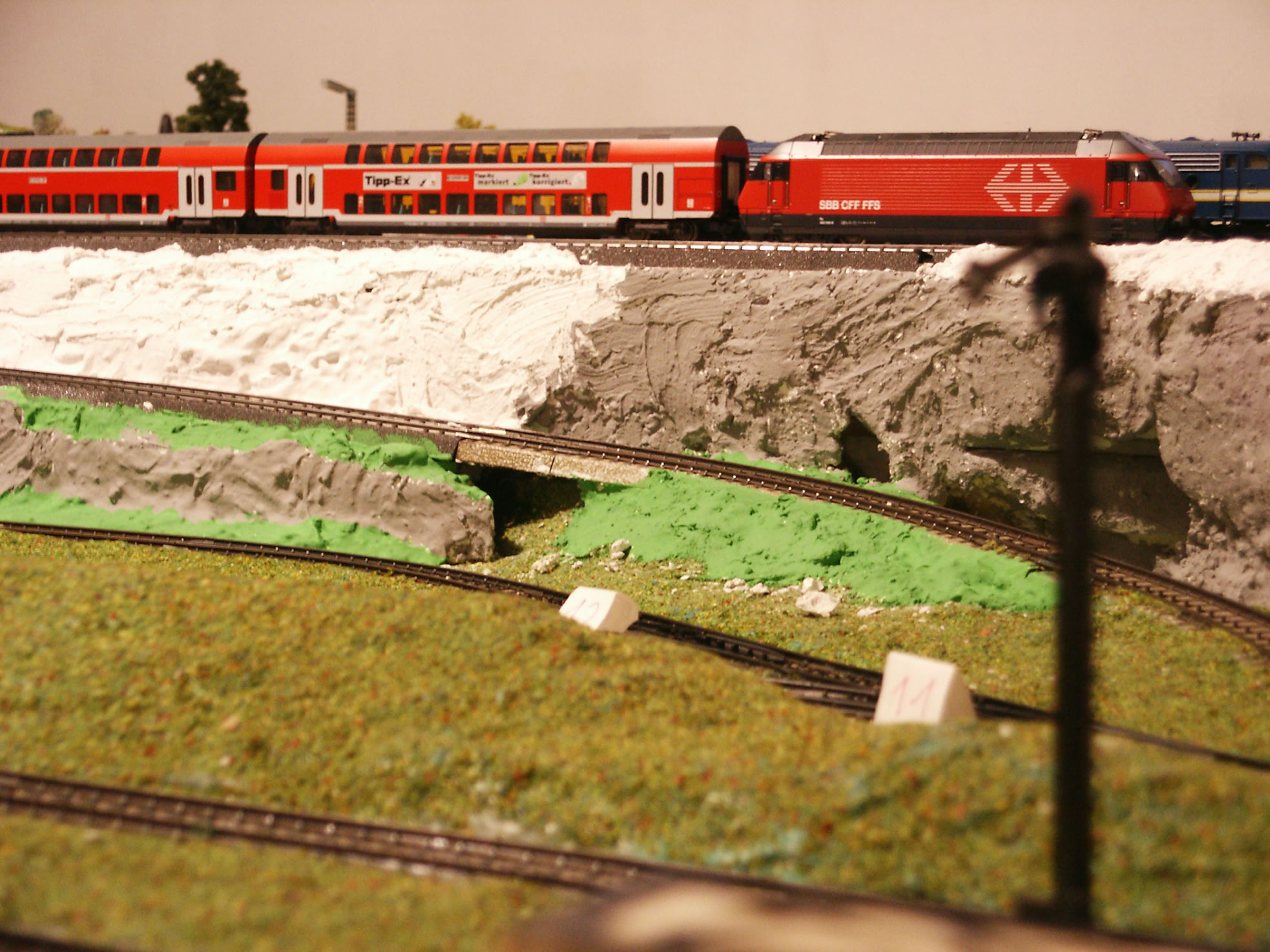 Die andere Abfahrt liegt im linken Anlagenbereich und verfügt über 2 Gleisanschlüsse. Der eine (links im Bild) wird erreicht, wenn der Güterbahnhofbereich durchfahren wird. Der andere Anschluss erfolgt über die große Gitterbrücke (rechts im Bild) und beide münden über eine Bogenweiche in die einspurige Unterfahrung.