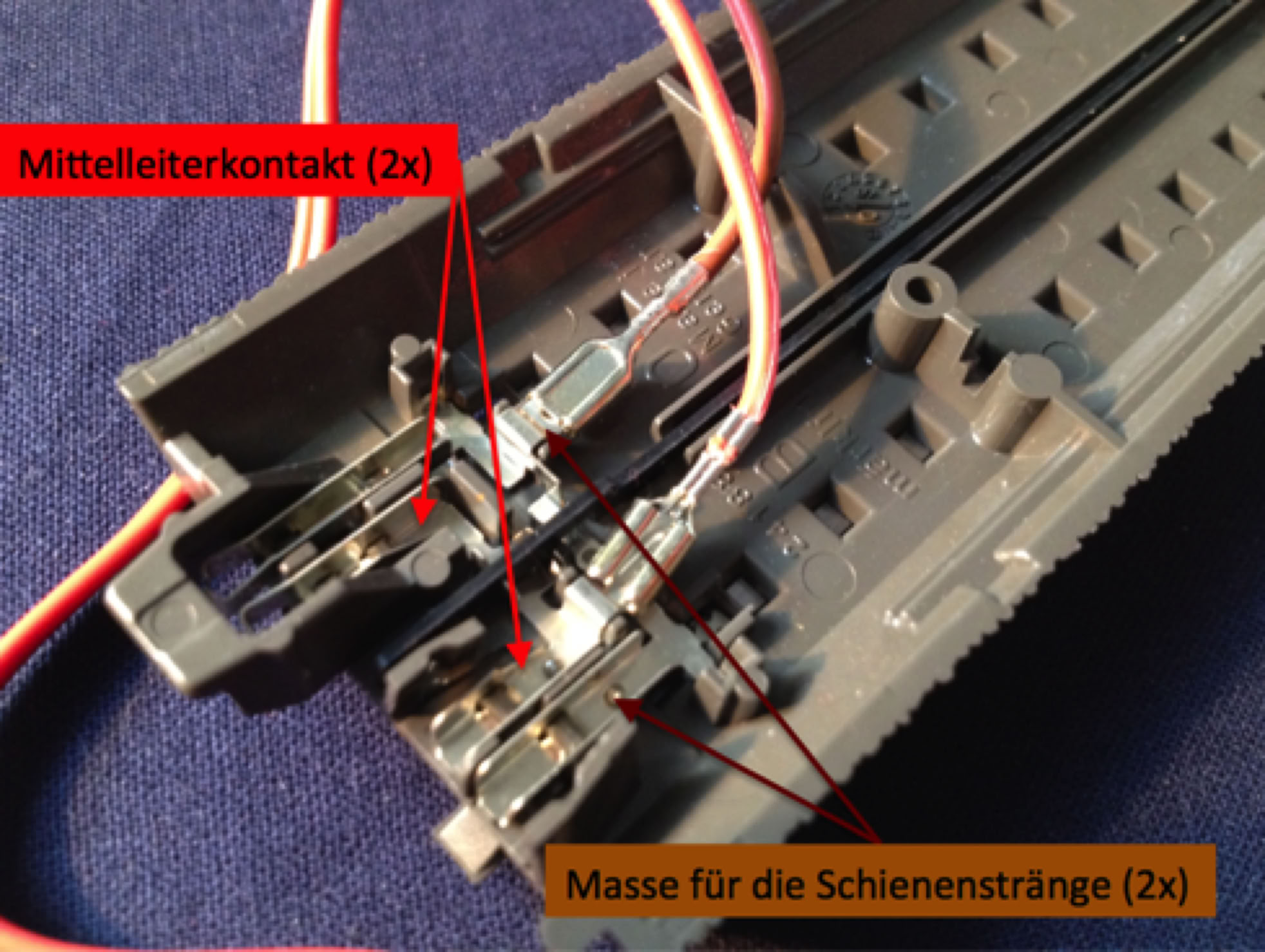 Beim Anschein von Fahrspannung wird das rote Kabel immer an den Mittelleiter angeschlossen, das braune Kabel an die beiden Schienenstränge.